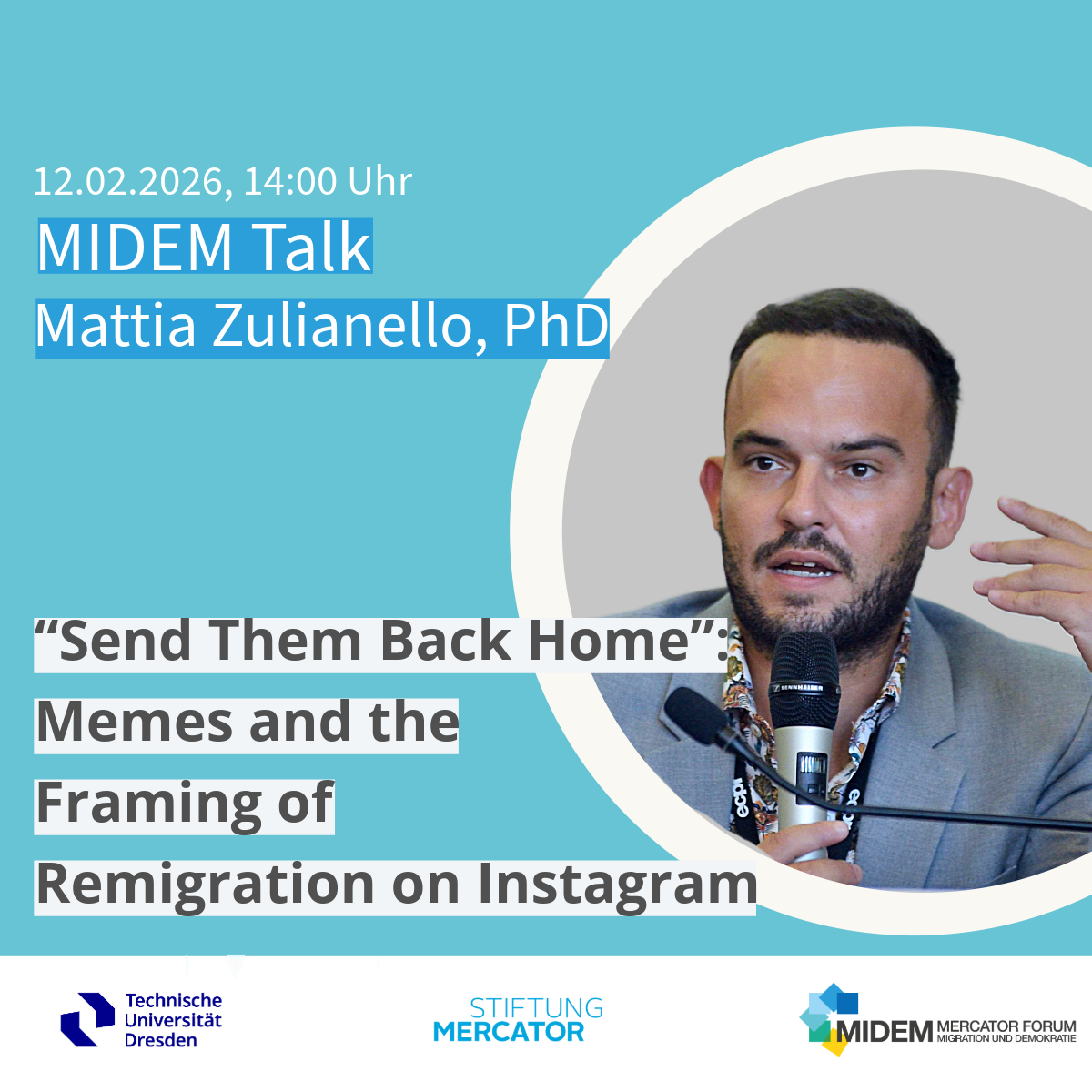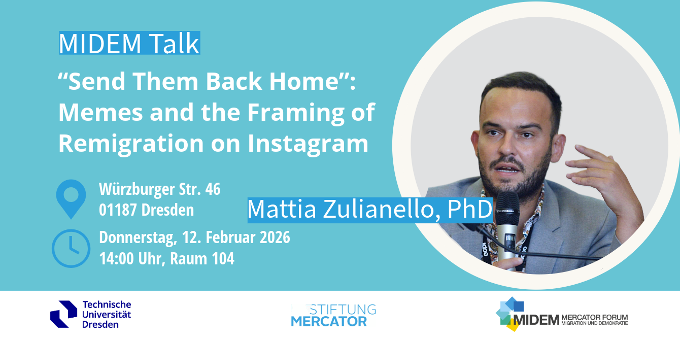 MIDEM ist ein Forschungszentrum an der TU Dresden, gefördert durch die Stiftung Mercator. Unter der Leitung von Prof. Dr. Hans Vorländer untersucht es Formen, Instrumente und Prozesse politischer Verarbeitung von Migration in demokratischen Gesellschaften – in einzelnen Ländern und im vergleichenden Blick auf Europa.