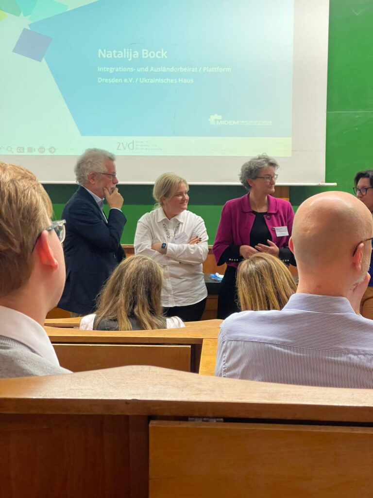 Das zweite Panel bot Perspektiven aus der Praxis: Alla Belikova-Shoichet (Landesbeirat für Partizipation, Berlin), Kirstin von Graefe (Thüringer Agentur für Fachkräftegewinnung) und Natalija Bock (Integrations- und Ausländerbeirat Dresden) berichteten aus ihrer Arbeit mit geflüchteten Frauen. Sie betonten die Bedeutung regionaler Netzwerke, niederschwelliger Beratungsangebote und gezielter Unterstützung in Branchen mit Fachkräftemangel.
