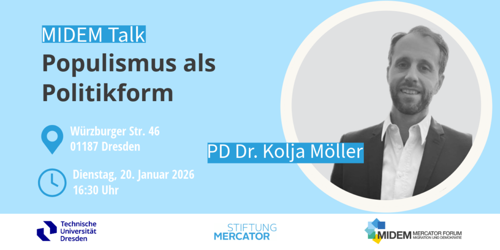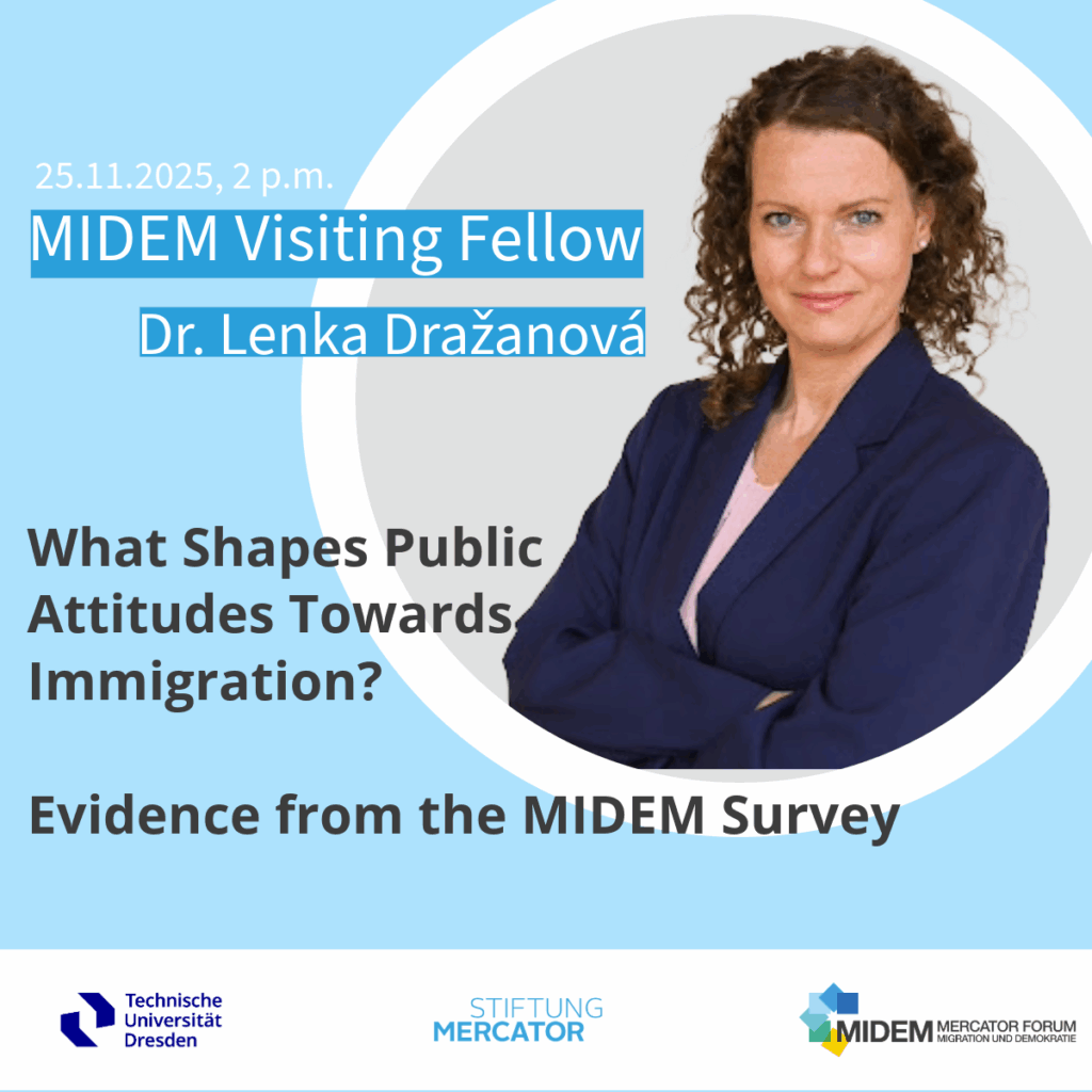 Im Rahmen ihres MIDEM Visiting Fellowships greift Dr. Lenka Dražanová auf aktuelle Ergebnisse der jüngsten MIDEM-Datenerhebung zur affektiven Polarisierung zurück. Sie zeigt, welche Faktoren die öffentliche Meinung zum Thema Einwanderung prägen und gibt Einblicke in neue Trends sowie gesellschaftliche Dynamiken, die sich aus der aktuellen MIDEM-Umfrage ableiten lassen.