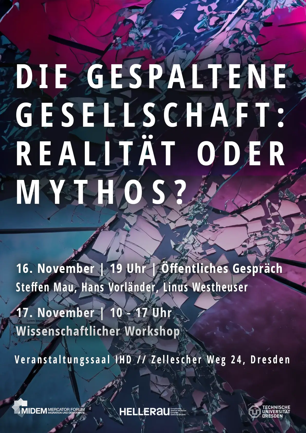 Am 16. November 2023 zog die von MIDEM und dem Europäischen Zentrum der Künste HELLERAU organisierte Diskussionsrunde „Die gespaltene Gesellschaft: Realität oder Mythos?“ ein breites Publikum aus den Bereichen Gesellschaft, Politik und Wissenschaft in den Konferenzraum des IHD. Die Eröffnung des Abends erfolgte durch die begrüßenden Worte von Hans Vorländer, dem Leiter von MIDEM, und Carena Schlewitt, der künstlerischen Leiterin des Europäischen Zentrums der Künste HELLERAU. Anschließend richtete Ursula M. Staudinger, Rektorin der Technischen Universität Dresden, ihre Worte an die Anwesenden.