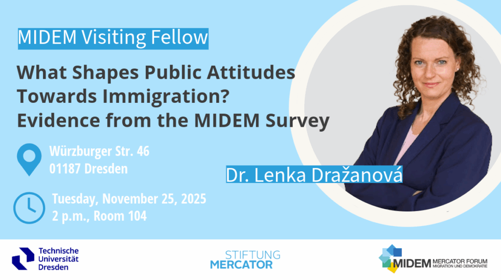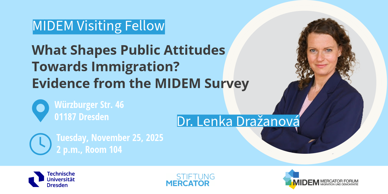 Dr. Lenka Dražanová ist Politikwissenschaftlerin und war zuletzt Research Fellow am Migration Policy Centre des European University Institute in Florenz. Ihre Forschung untersucht zentrale gesellschaftliche Herausforderungen wie wachsende Polarisierung, die Verbreitung autoritärer Einstellungen und den Wandel von Gruppenidentitäten. Mithilfe fortgeschrittener quantitativer Methoden analysiert sie die Entstehungsbedingungen individueller Einstellungen gegenüber Minderheiten und historisch benachteiligten Gruppen sowie die Ursachen sinkender Toleranz in europäischen Gesellschaften. Während ihres Aufenthalts bei MIDEM untersucht sie anhand von MIDEM–Polarisierungsdaten, welche sozio-demographische Faktoren zur individuellen (De-)Polarisierung im Kontext von Migration beitragen.